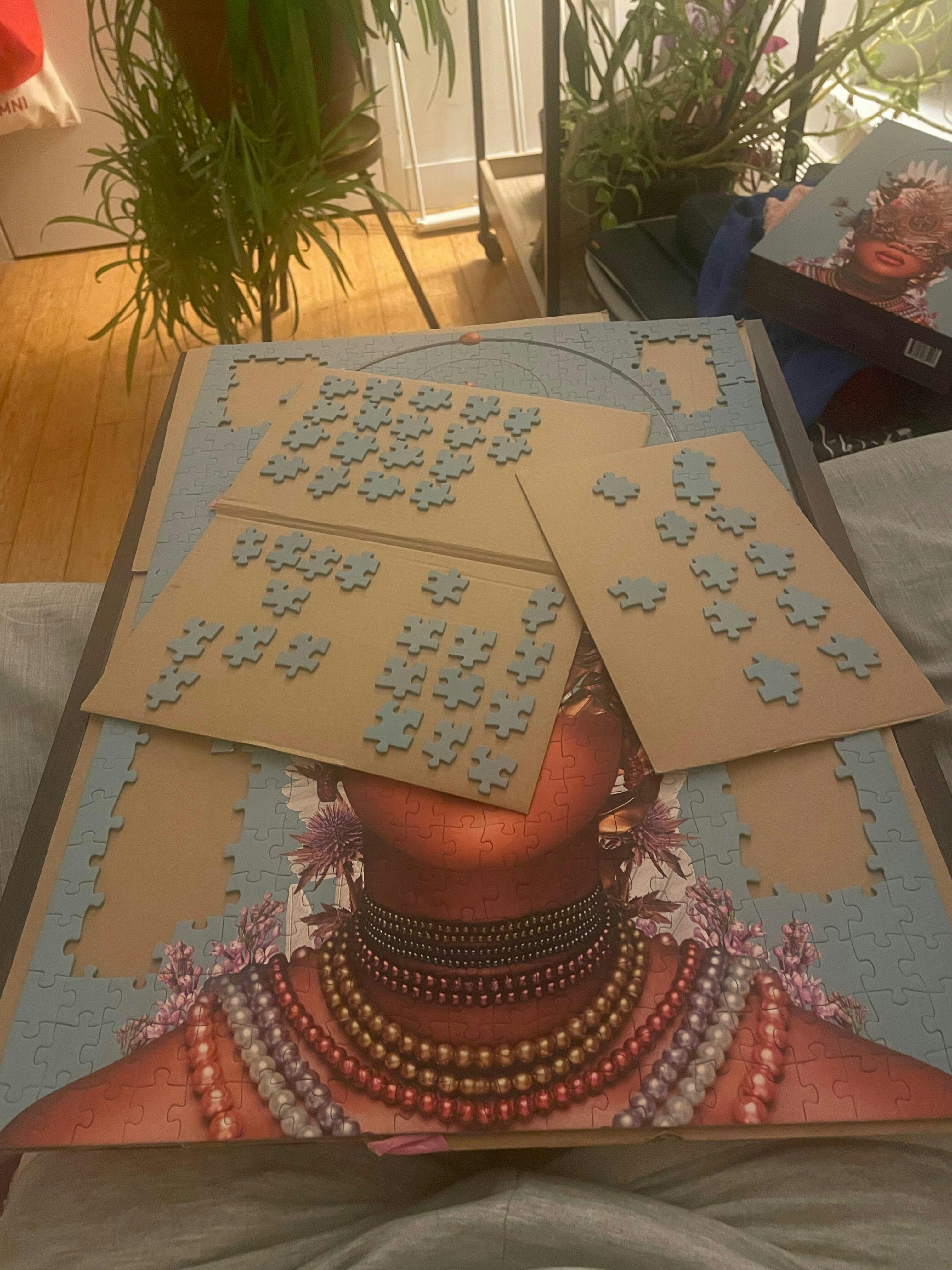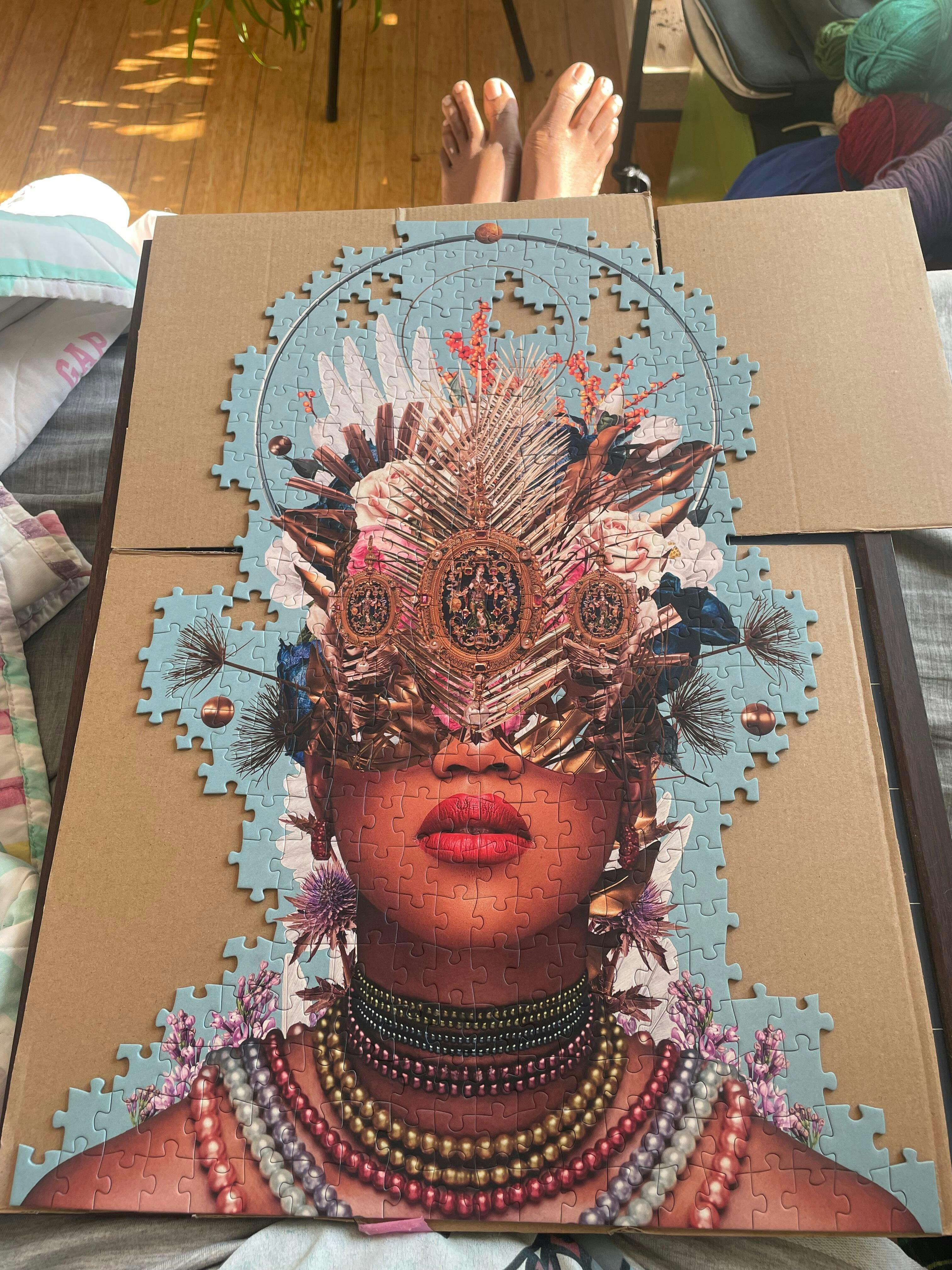 This 500-piece jigsaw puzzle features surreal collage artwork by Frank Moth, known for their dreamy, retro-futuristic style. The image blends floral elements with cosmic themes, depicting a woman whose face is adorned with blooming flowers and otherworldly ornaments. Ideal for fans of modern art puzzles, floral puzzles, and surrealist designs, this puzzle offers a satisfying challenge and a visually stunning final image. A great choice for adults looking for unique jigsaw puzzles with artistic, imaginative themes.